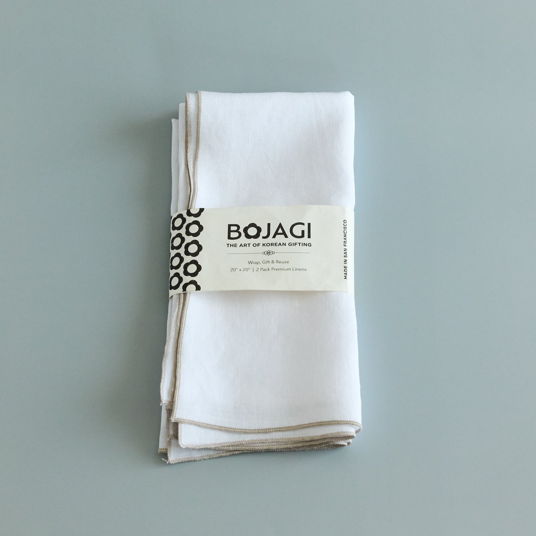 Gift thoughtfully. Wrap sustainably. Elevate your gifting with our handcrafted Bojagi wraps, inspired by the serene, milky hues of the Korean Moon Jar. White premium Korean linen with delicate natural embroidery edge. Made in San Francisco from a premium blend of natural linen and ramie, these wraps transform a simple gesture into a lasting keepsake.